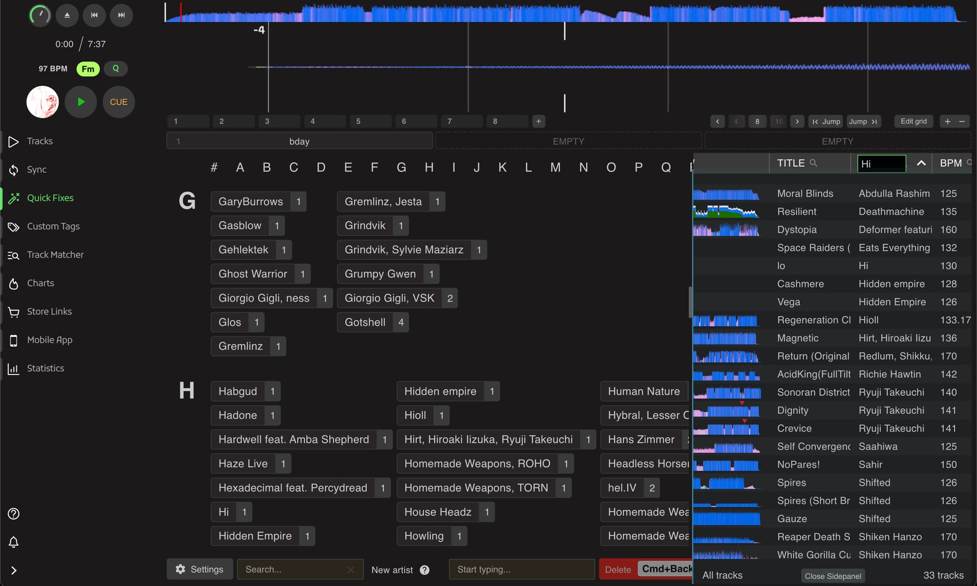 I tried your suggested workflow and it feels a bit cluttered on my laptop screen. I also discovered that the search is a wildcard search. Some artist names are not working well, like “Hi” in this case.