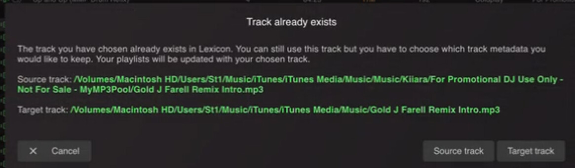 So you have to remove those before relocating the old ones there. But before you do that, which of those 2 tracks are in your playlists? The source track or the target track? Just so we don’t break your playlists.