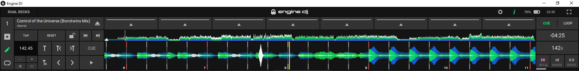 In the case of another track analyzed by the normal VDJ method, the add/delete buttons are enabled, apparently when the kick drum is going to start: