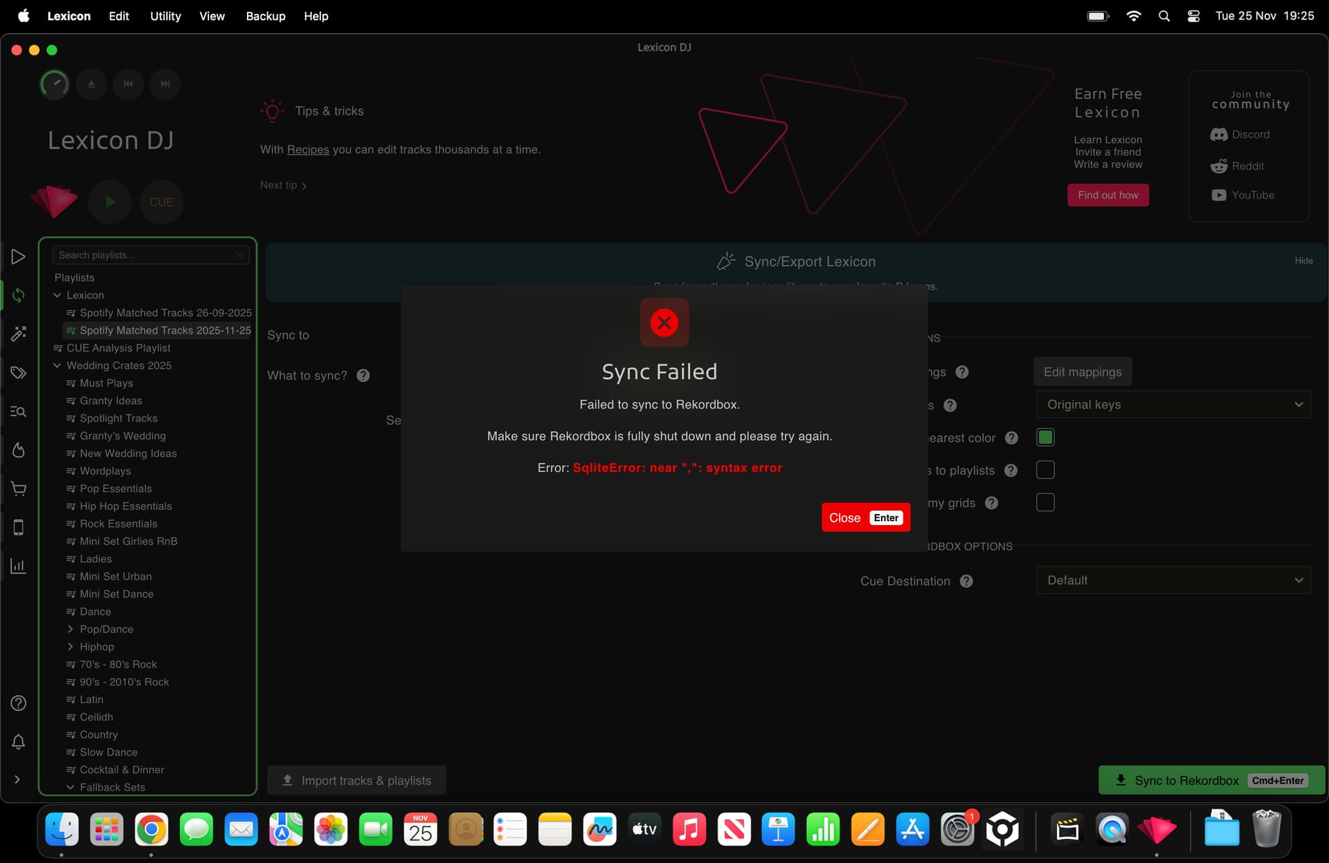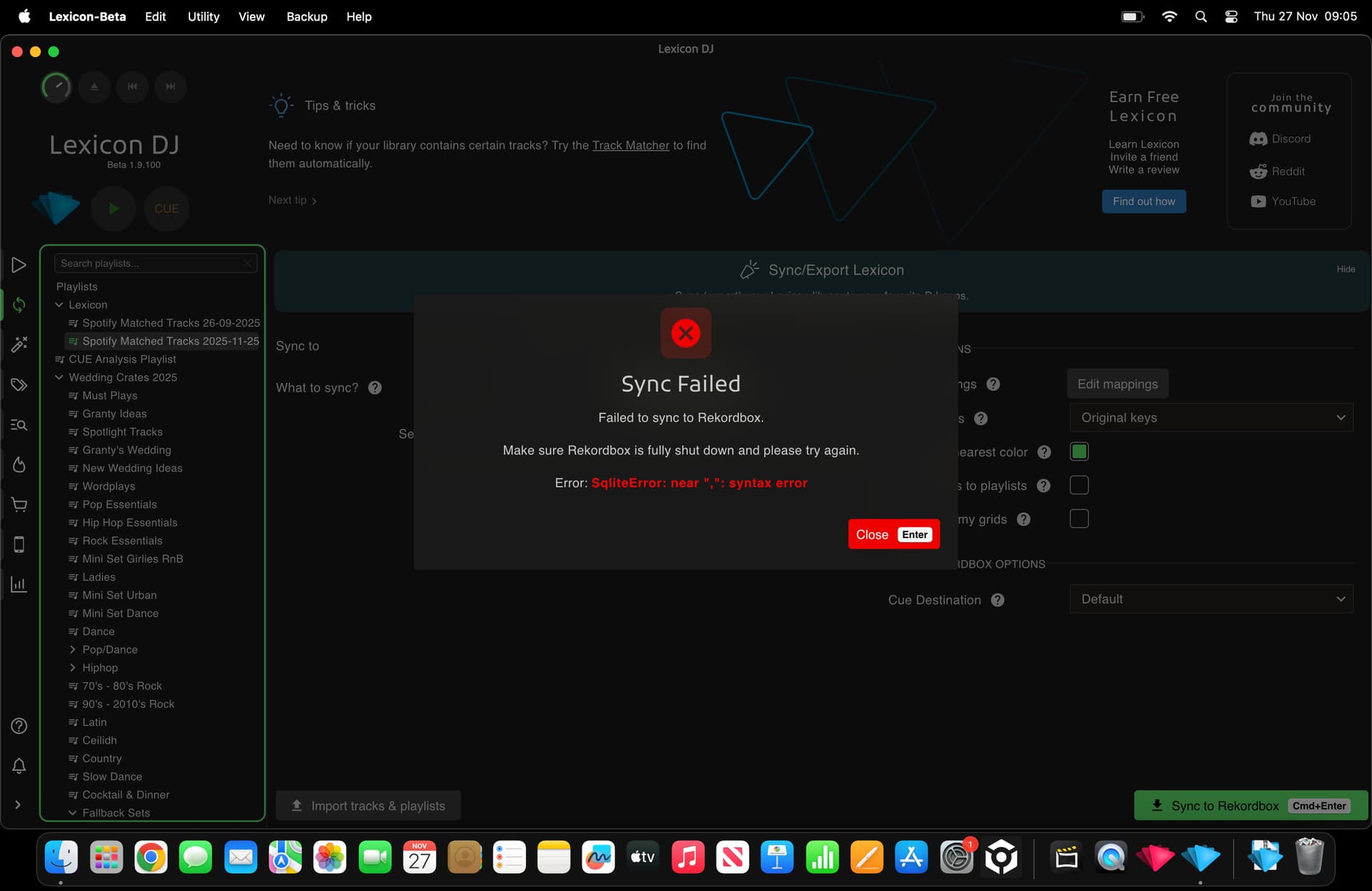 can’t sync a playlist to Rekordbox. Not used Lexicon in about a month and first time back I have this issue