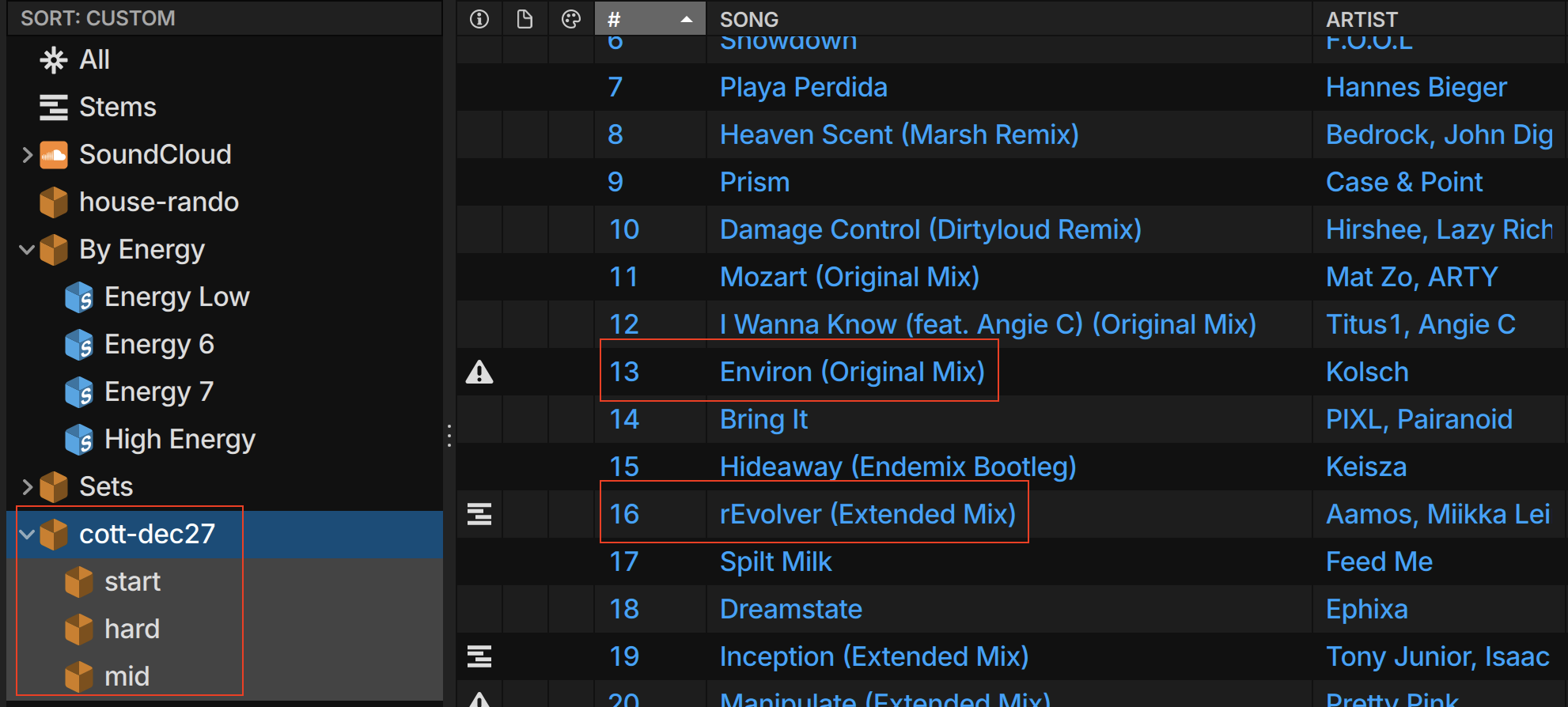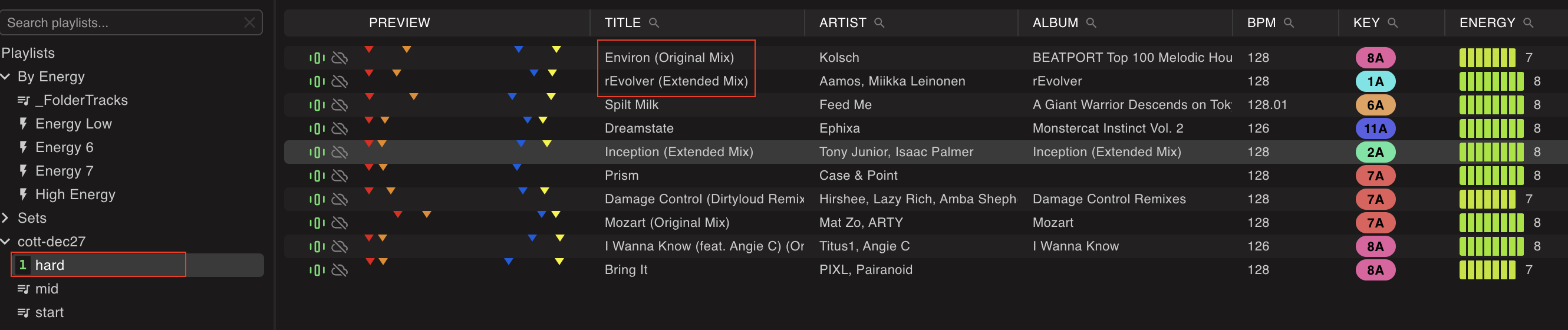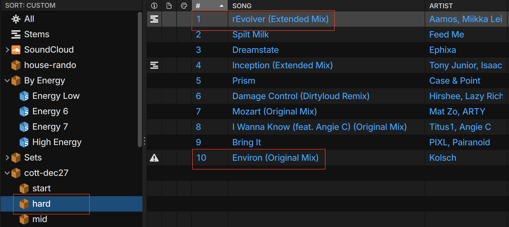 Screenshot 3: In Lexicon, playlist ‘hard’ is selected and shows Environ is above rEvolver instead of at the end of the playlist.
