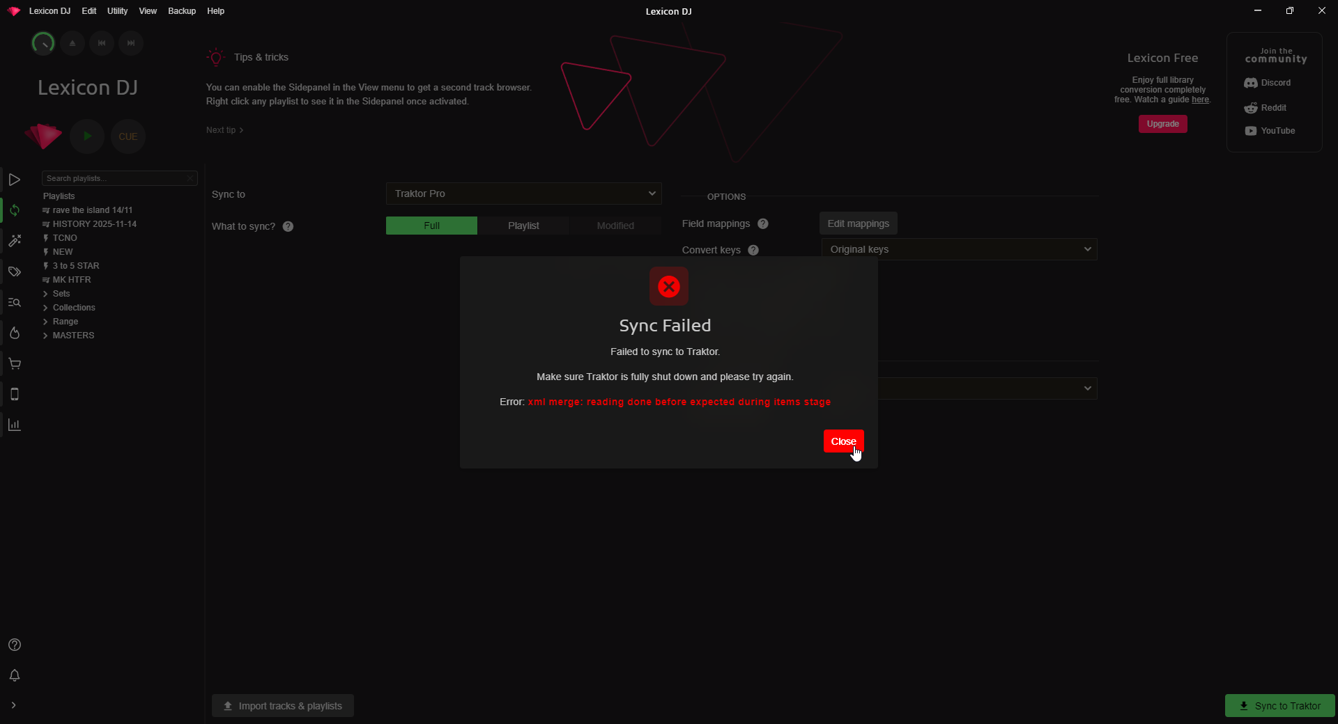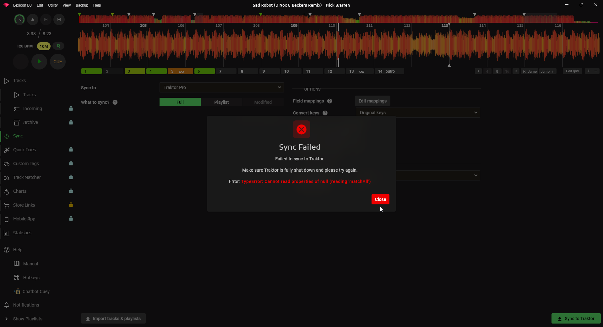 Imported my Rekordbox collection (6000+ tracks) and trying to export my custom tags, color etc to Traktor but hitting the above error on sync. Any ideas?